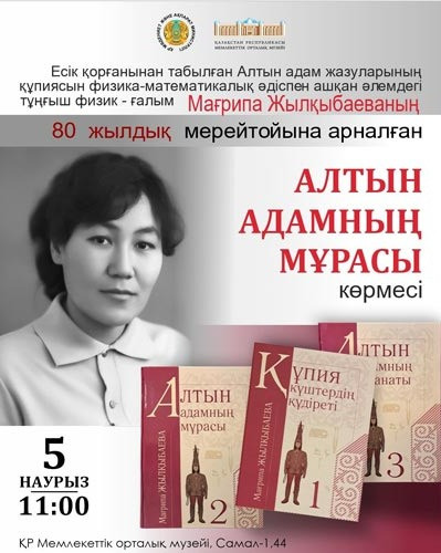 Алматыдағы Мемлекеттік орталық музейде жаратылыстанушы ғалым Мағрипа Жылқыбаеваның 80 жылдық мерейтойына арналған «Алтын адамның мұрасы» атты танымдық көрме ашылды. Көрме ғалымның шығармашылық жолы мен ғылыми мұрасын таныстырып, оның кванттық физика әдістерін қолдана отырып, Есік қорғанындағы Алтын адам мұрасының сырын ашу жолындағы еңбегіне арналған.
