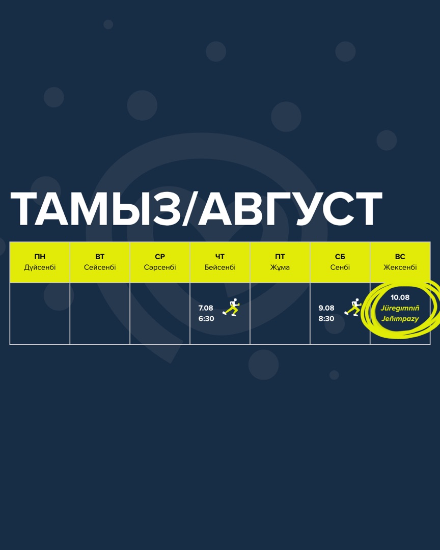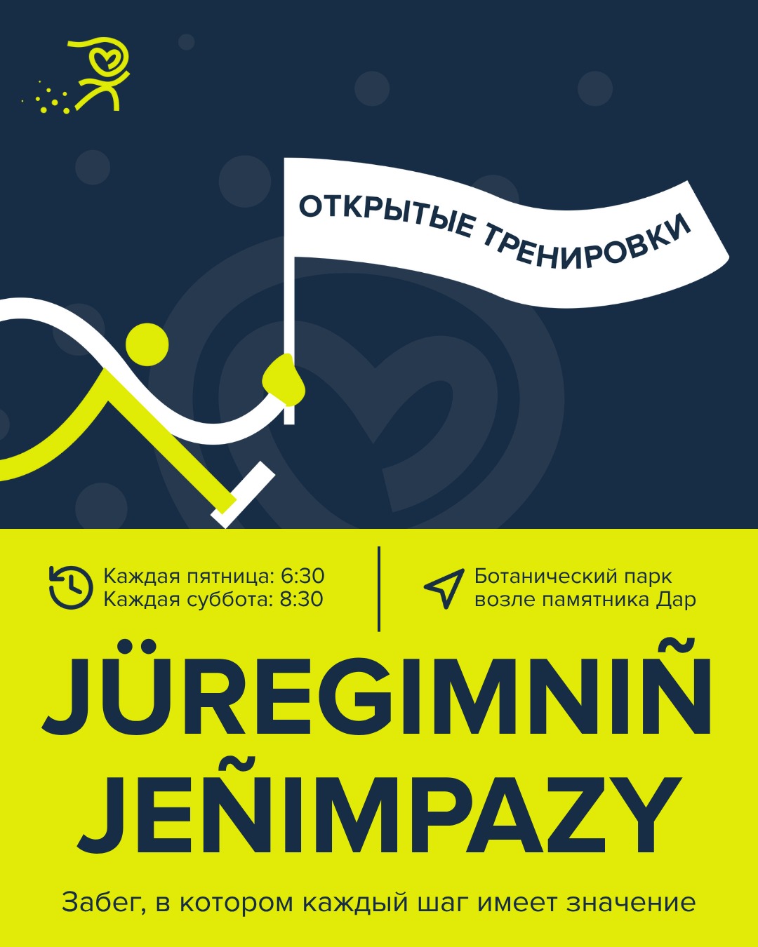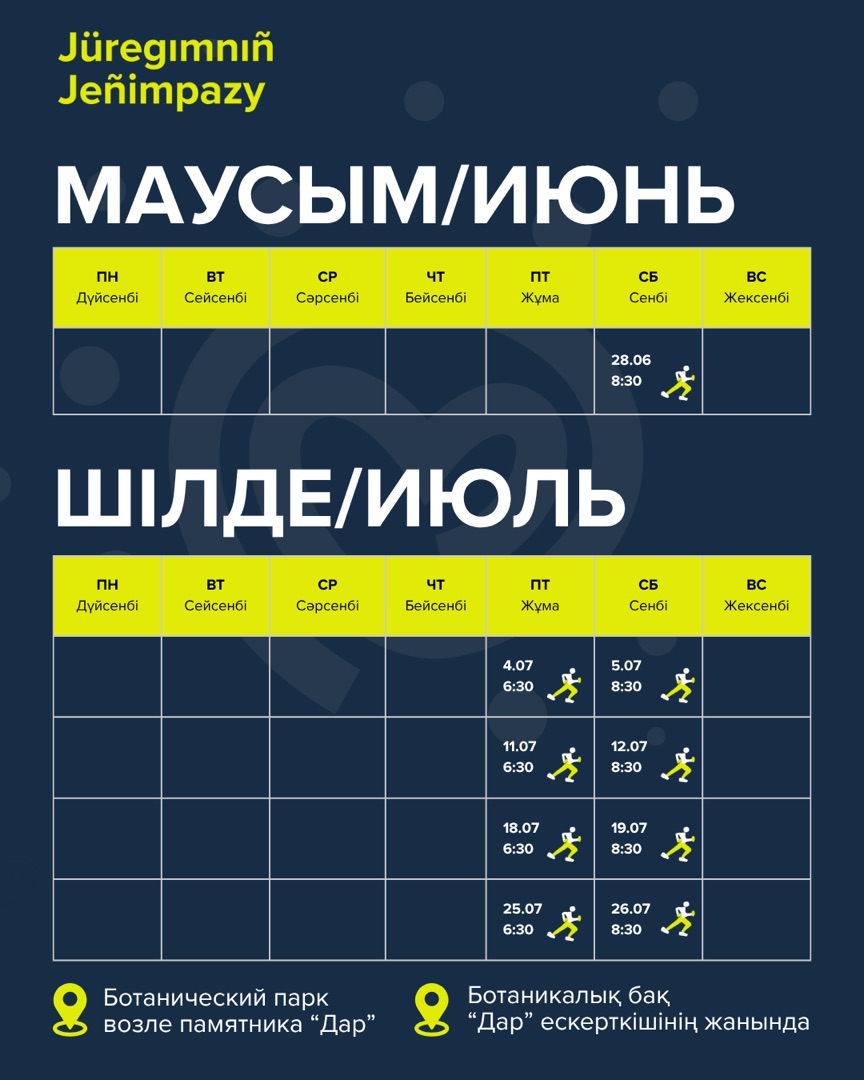 Астанада «Jüregımnıñ Jenımpazy» қалалық жүгіру фестиваліне дайындық аясында алғашқы ашық жаттығу 28 маусым күні сағат 8:30-да Ботаникалық бақта («Дар» ескерткіші маңында) өтеді. Іс-шараны «Heart Center Foundation» қоғамдық қоры ұйымдастырады.