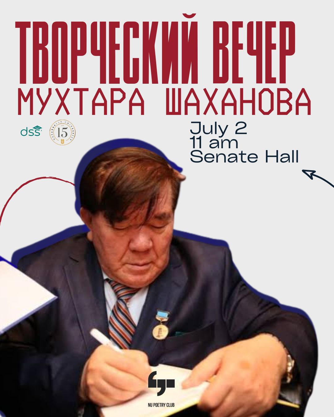 2 июля в 11:00 в Назарбаев Университете (Астана, проспект Кабанбай батыра, 53, зал Senate Hall) состоится творческий вечер известного поэта, общественного деятеля и народного писателя Казахстана Мухтара Шаханова. Организатором мероприятия выступает студенческий клуб NU Poetry.